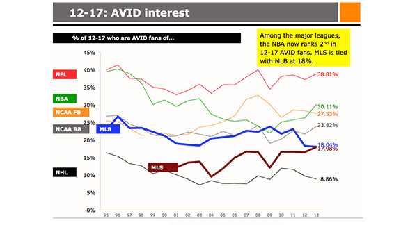 Dans ce dernier sondage, 18% des 12-17 ans désignent la MLS et le soccer comme leur compétition/sport favori. Le rapport annuel s’est intéressé à 31 sports différents et plus de 1500 kids ont été interrogés.