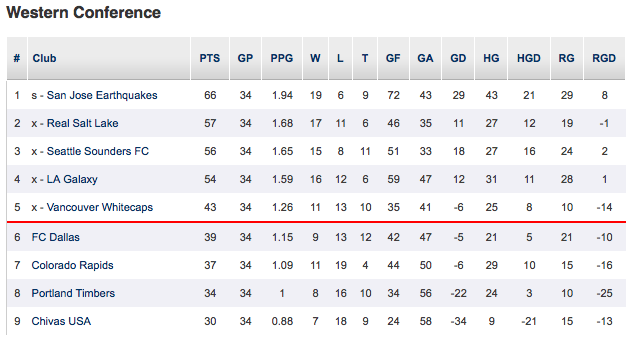 Seattle finit à la troisième place synonyme de dernière place qualificative directe pour les playoffs. Et Los Angeles dans tout ça? Une saison irrégulière pour le tenant du titre. Pas assez fort pour se qualifier directement en playoffs, mais assez costaud à partir de l’été grâce à ses joueurs désignés pour finir à la quatrième place et jouer les barrages contre le cinquième: les Whitecaps (moutons) de Vancouver, club créé en 2009 qui s’est effondré en deuxième partie de saison. Durant cet unique match (pas de retour), Los Angeles s’impose chez lui difficilement grâce à un but de son autre star et de son meilleur joueur, Landon Donovan, sur penalty ! Une première partie de saison vraiment limite pour le tenant du titre. Mais la concurrence était trop faible, malgré la belle remontée du FC Dallas, pour assister à une élimination des copains de Becks.