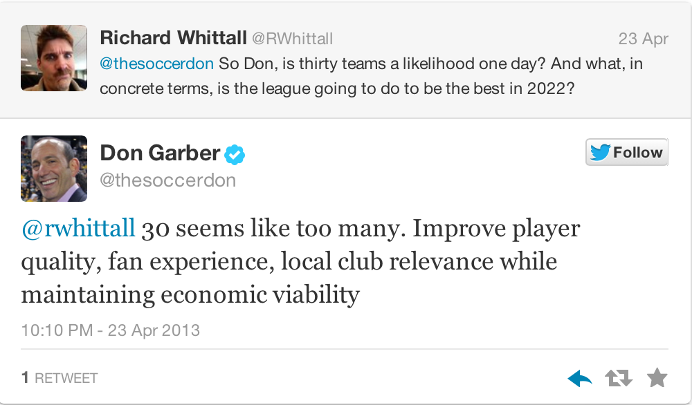 Du côté de la MLS, on défend la ligne de conduite établie dès la saison inaugurale en 1996: « Slowly but surely ». Grossièrement, si la Ligue veut grandir, elle ne doit pas faire de folie. Elle a encore en tête la longue agonie de la NASL qui avait finalement pris fin, en 1984 après une gestion financière des plus catastrophiques (https://majeureliguefootball.wordpress.com/2013/01/14/pele-et-les-trois-glorieuses/). Don Garber, le commissaire si prudent de la MLS, ne veut pas aller trop vite, et il faut bien avouer que sous sa houlette, la ligue se porte de mieux en mieux. Même si on aimerait tous un peu le brusquer de temps en temps…